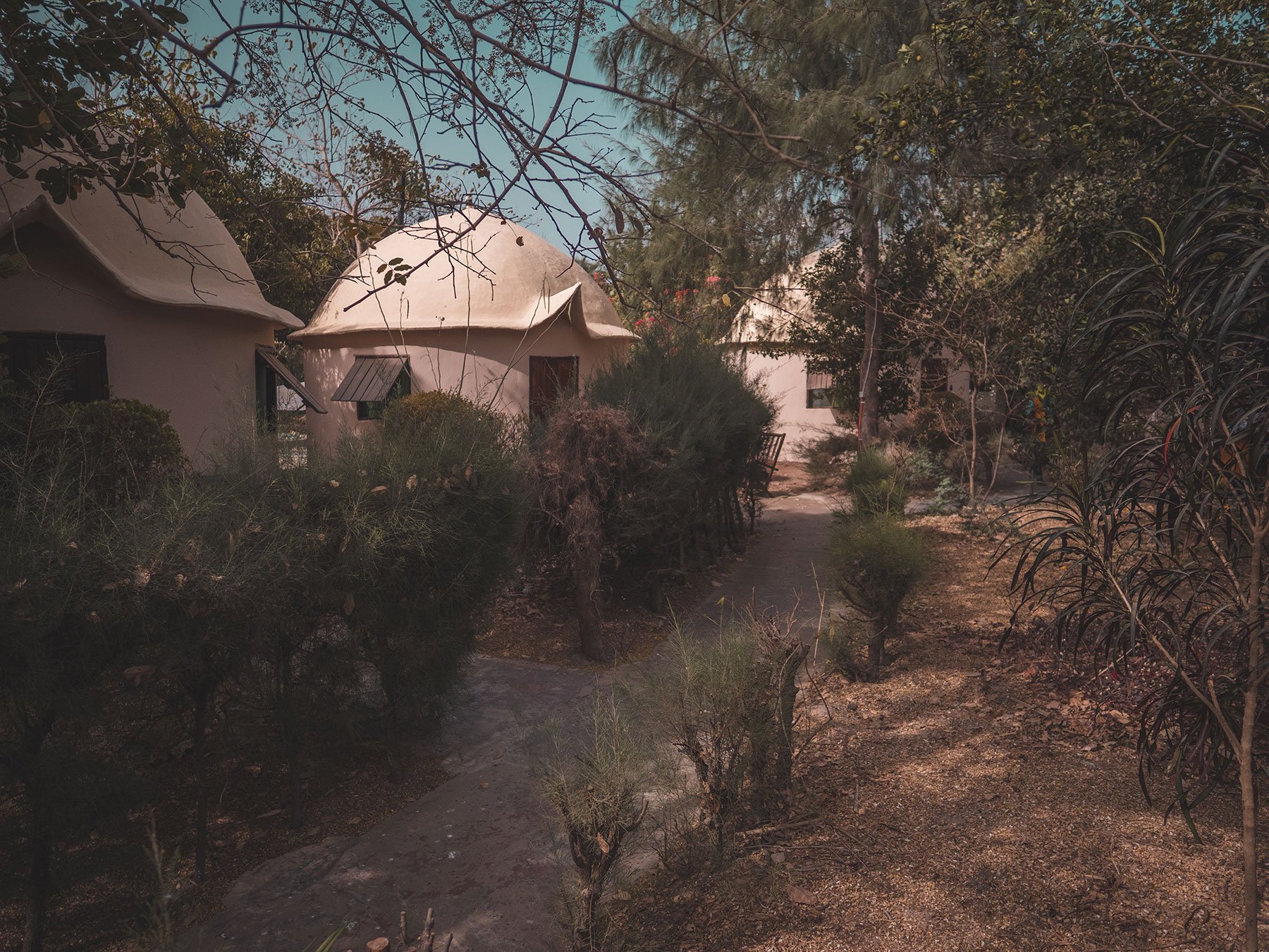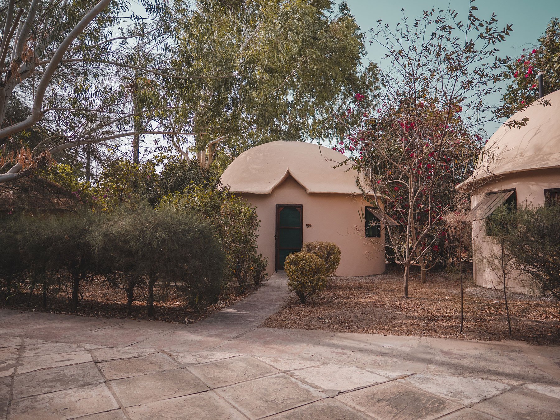 Our accommodation was a little round-house made of clay. It was fitted with wooden doors and wooden windows. Inside was the bedroom, a circular space except for the straight back wall which housed the bathroom. Within the bedroom was a lovely double-bed, a wicker wardrobe and a little dressing-table with a mirror and chair. It was simple but perfect.