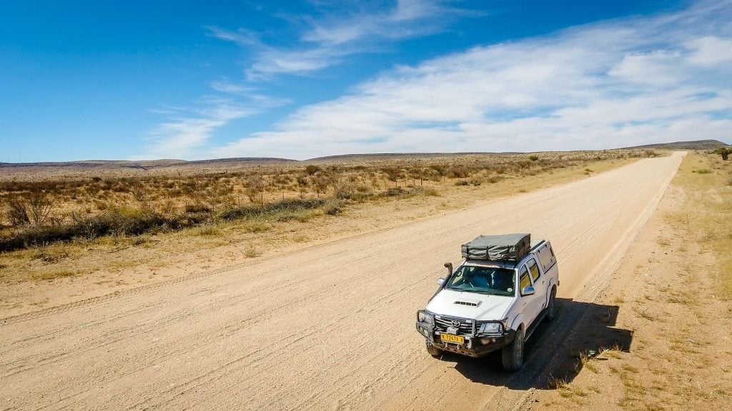 Drone view of Toyota Hilux 4x4 self-drive road-trip through Namibia, Africa
