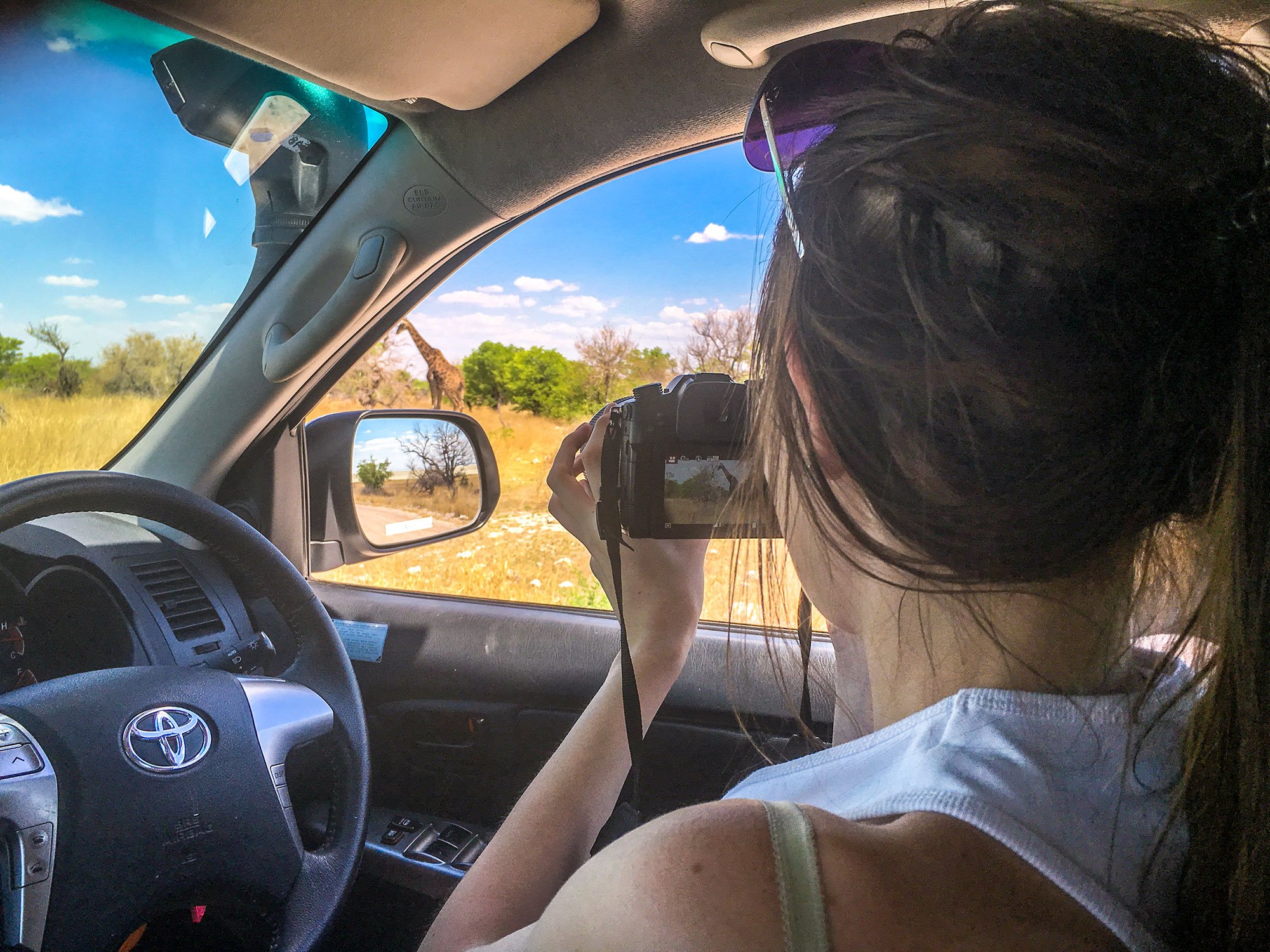 Ella photographing a giraffe on safari in Etosha National Park, Namibia, Africa