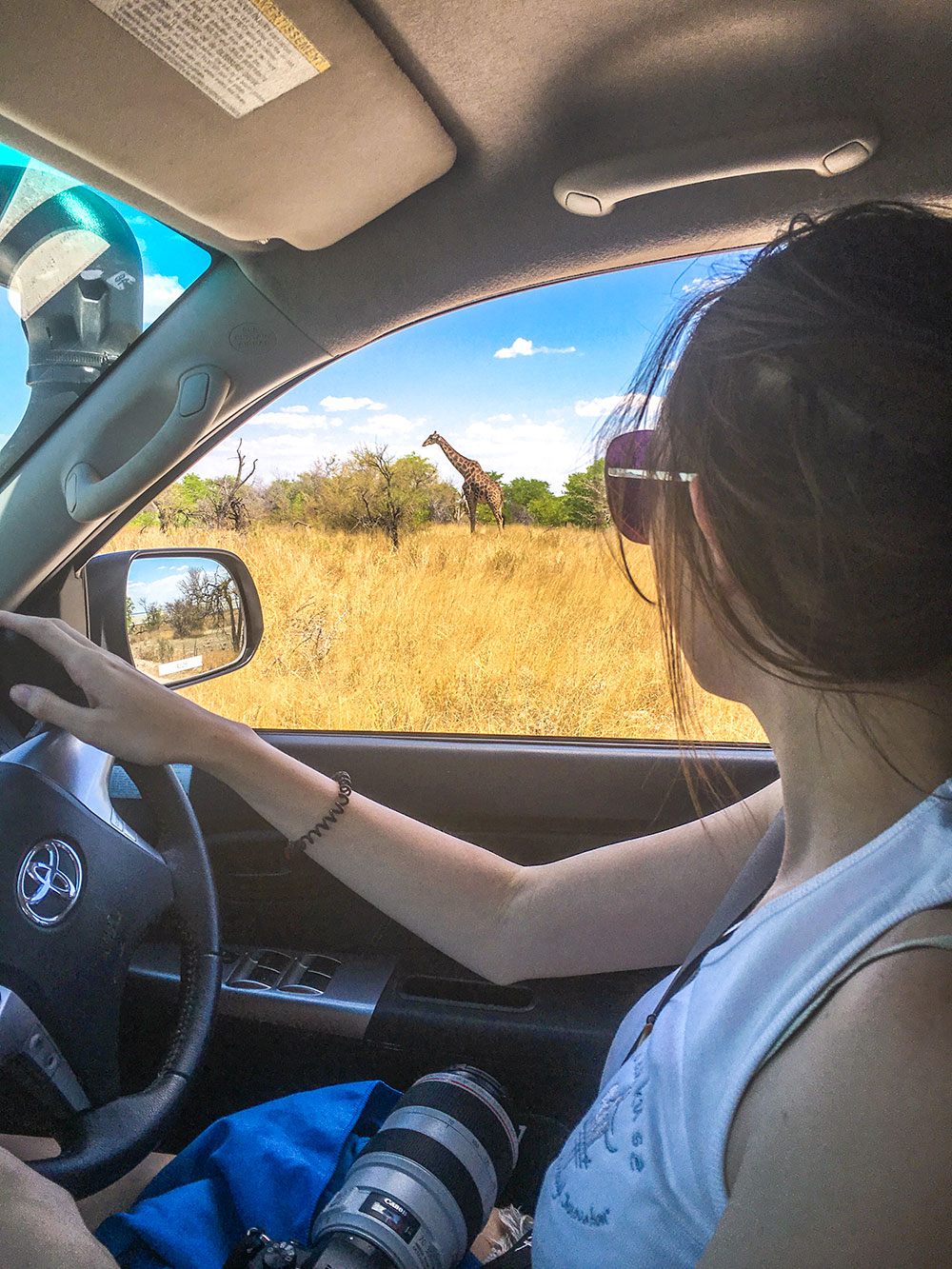 Ella photographing a giraffe on safari in Etosha National Park, Namibia, Africa