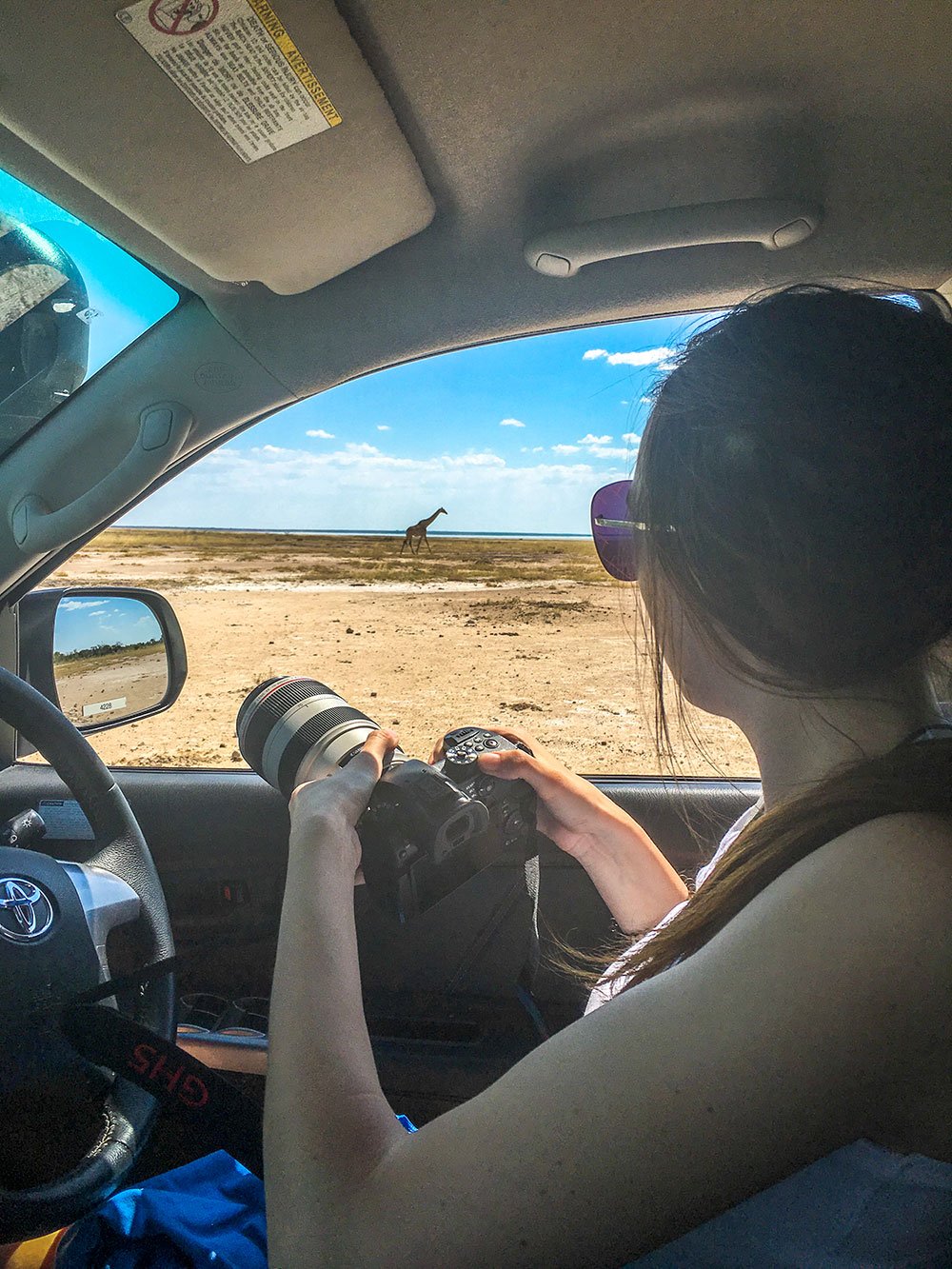 Ella photographing a giraffe on safari in Etosha National Park, Namibia, Africa