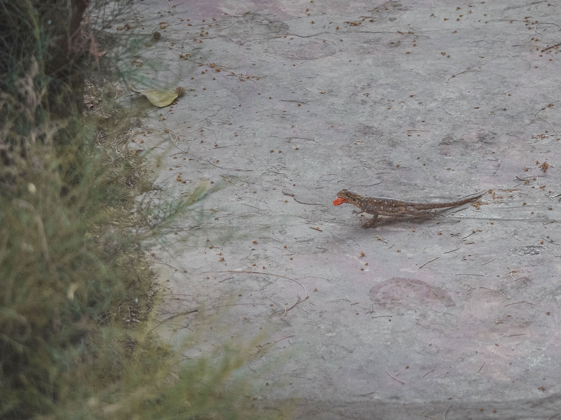 The first lizard I saw was stood in the middle of the footpath, a long orange object protruding from its mouth. I furrowed my brow. What was that? It looked like the tail-end of a prawn! Perhaps it was. After all, prawn was on the lunch menu here!