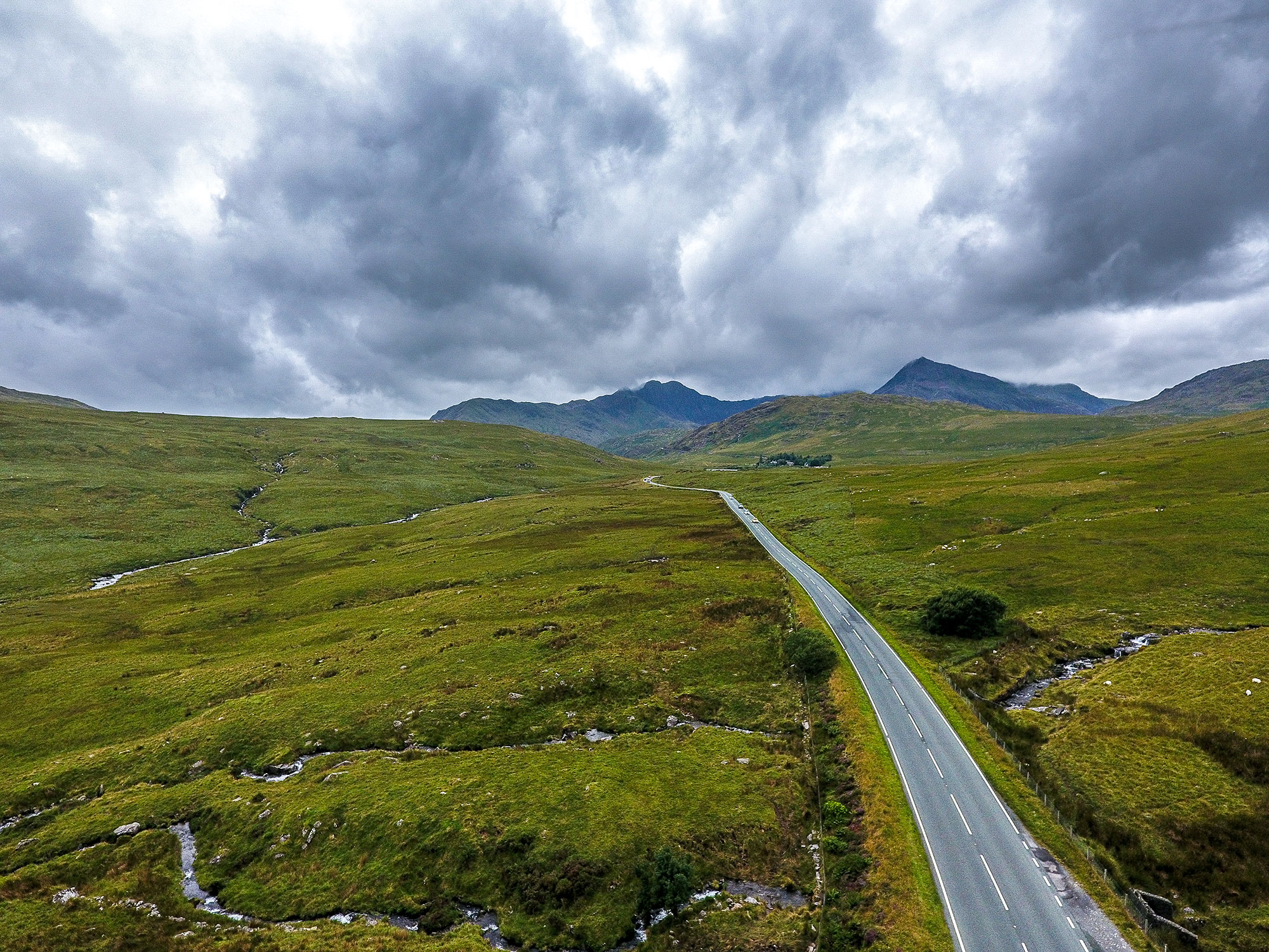 Drone view of Snowdonia national Park with mount Snowdon in the background