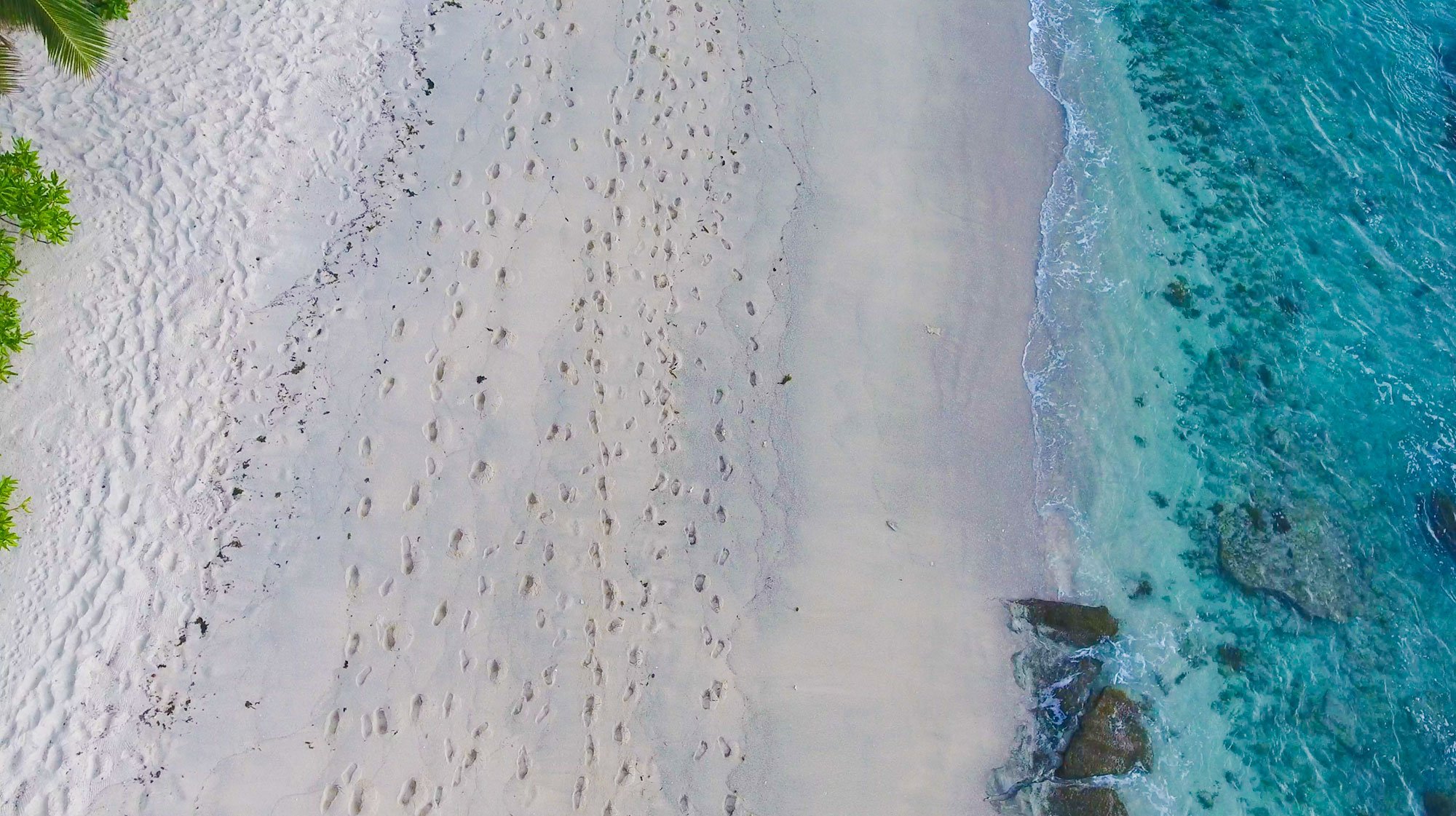 Drone view of Takamaka beach, seunset and ocean on Mahe island, Seychelles