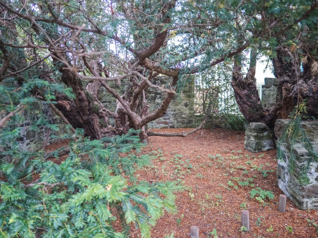 In order to preserve the tree, a high stone wall was built around it with a few windows so you can still lay your eyes on the majestic yew tree.
