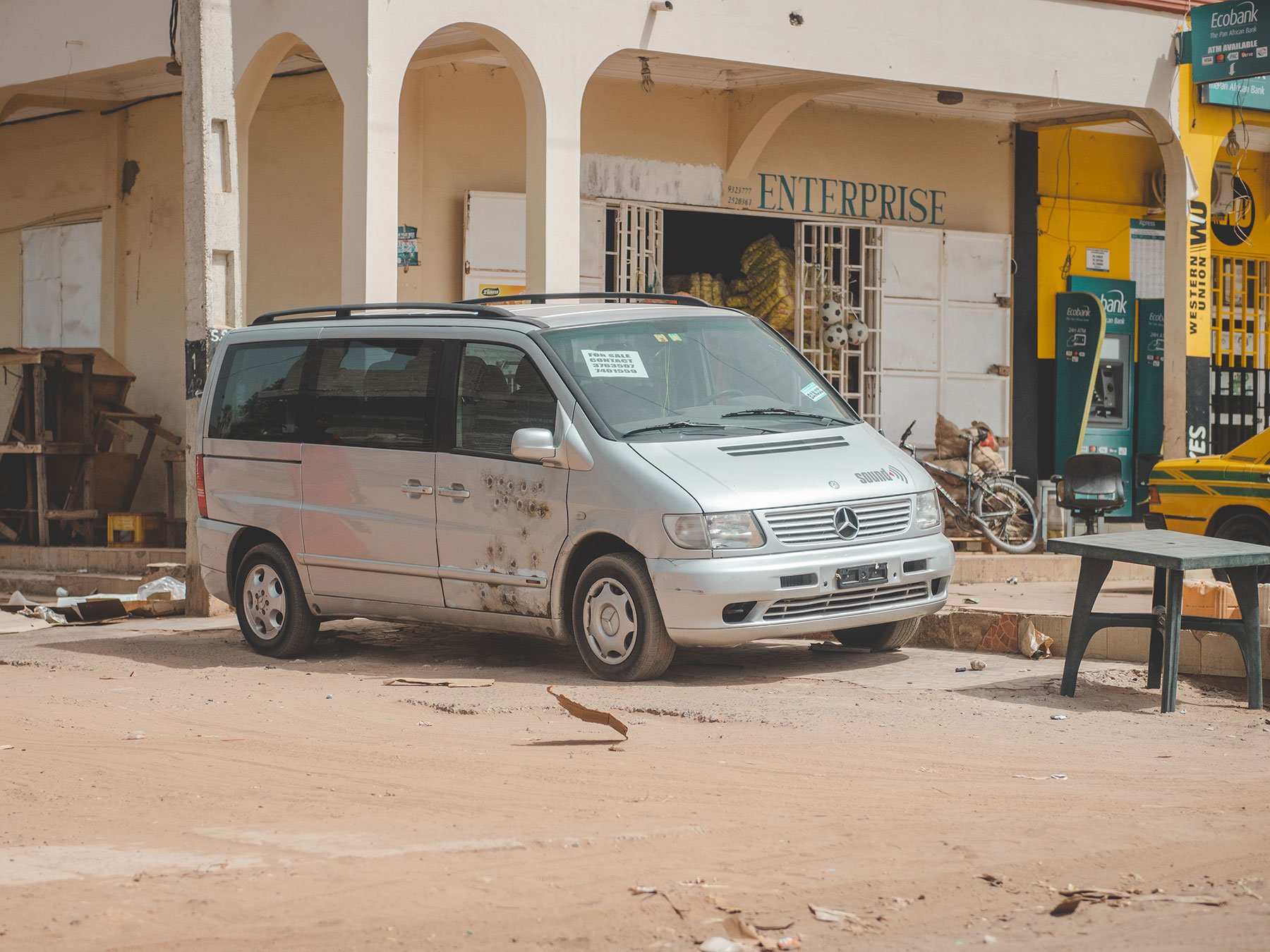 We drove past a parked silver Mercedes van. My eyes were drawn to its driver-side door which was littered with what looked like bullet-holes. My eyes widened in surprise. Was I really seeing this right? In the windscreen was a piece of paper which said ‘for sale’. I was left wondering if its previous owner survived or not. I wasn’t sure what to think.