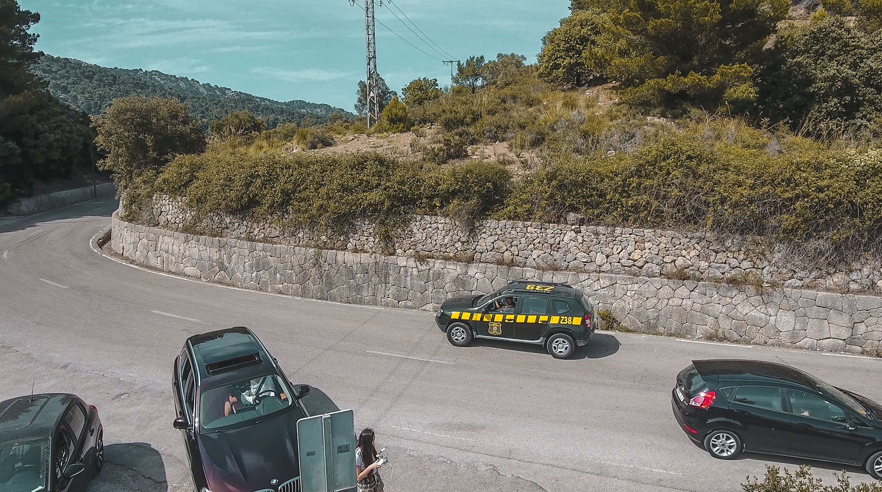 Droney was up in the air and Lewis started to drive George down the road. As he set off I noticed a black and yellow car approaching us. It looked like an official vehicle of some sort. Well, I’d only just flown the drone so there couldn’t have possibly been a complaint, I concluded. Other than a complaint of being a nuisance, I didn’t think I was doing anything wrong so I continued to fly and capture some lovely videos of George taking on the bends.