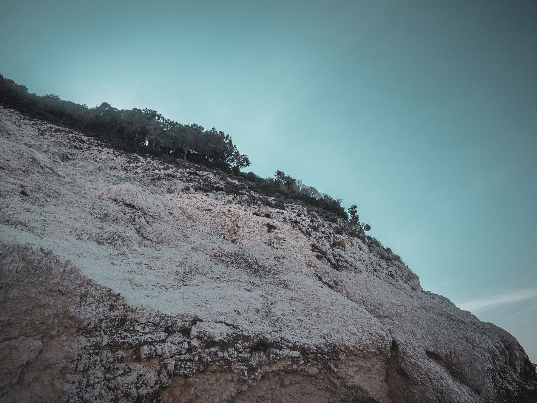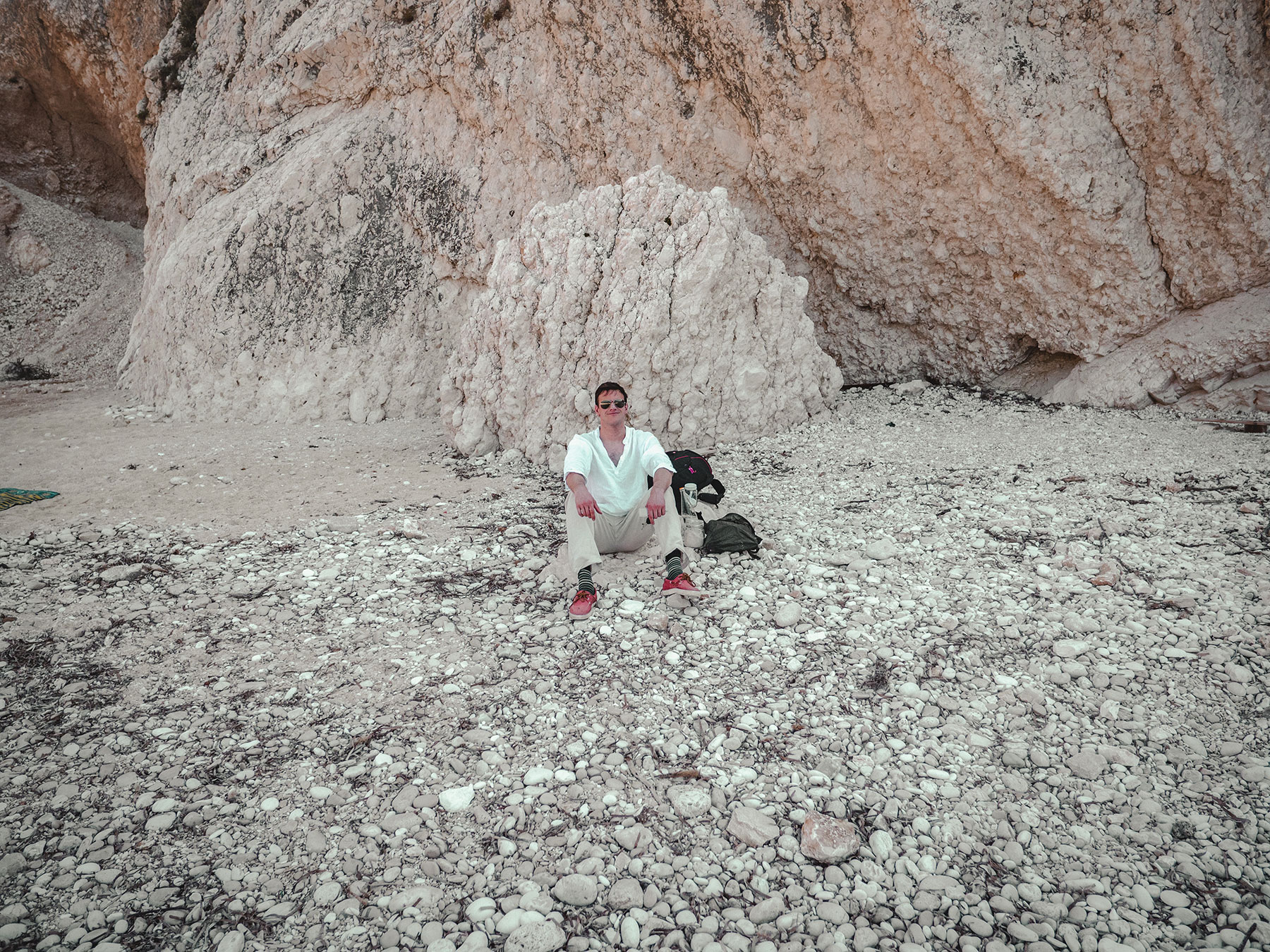 Myrtos beach is made-up of sediment from the eroding limestone cliffs that surround it. The end-product is an array of crisp-white, round pebbles which look beautiful but are no friend of the sensitive foot, as I learnt the hard way.