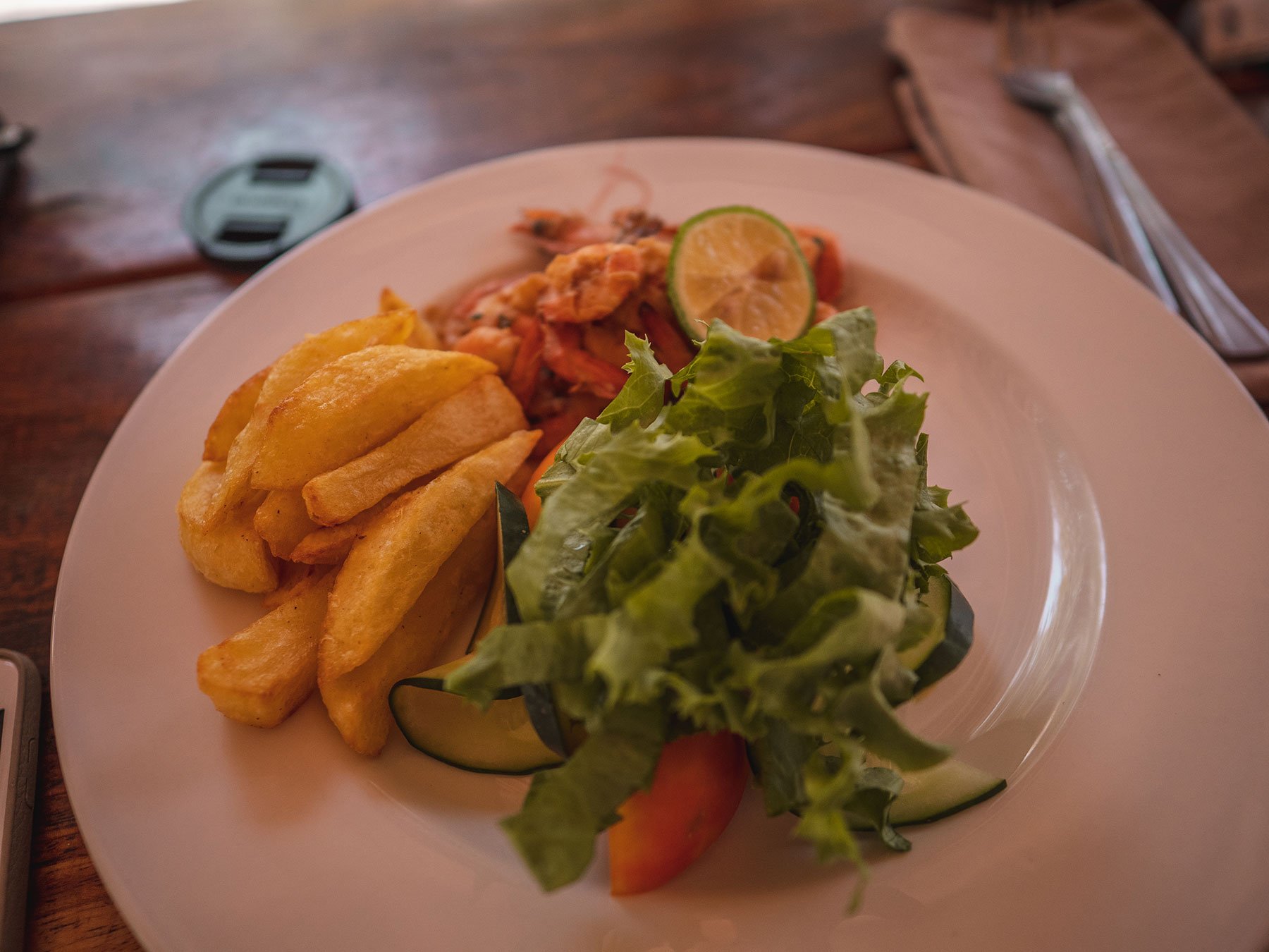On the lunch menu at the lodge was fresh prawns and chips. Continuing with my daring streak, I ordered this.
