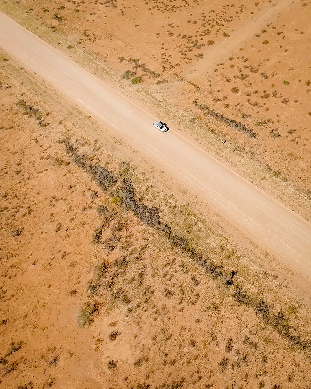 Drone view of Toyota Hilux 4×4 self-drive road-trip through Namibia, Africa
