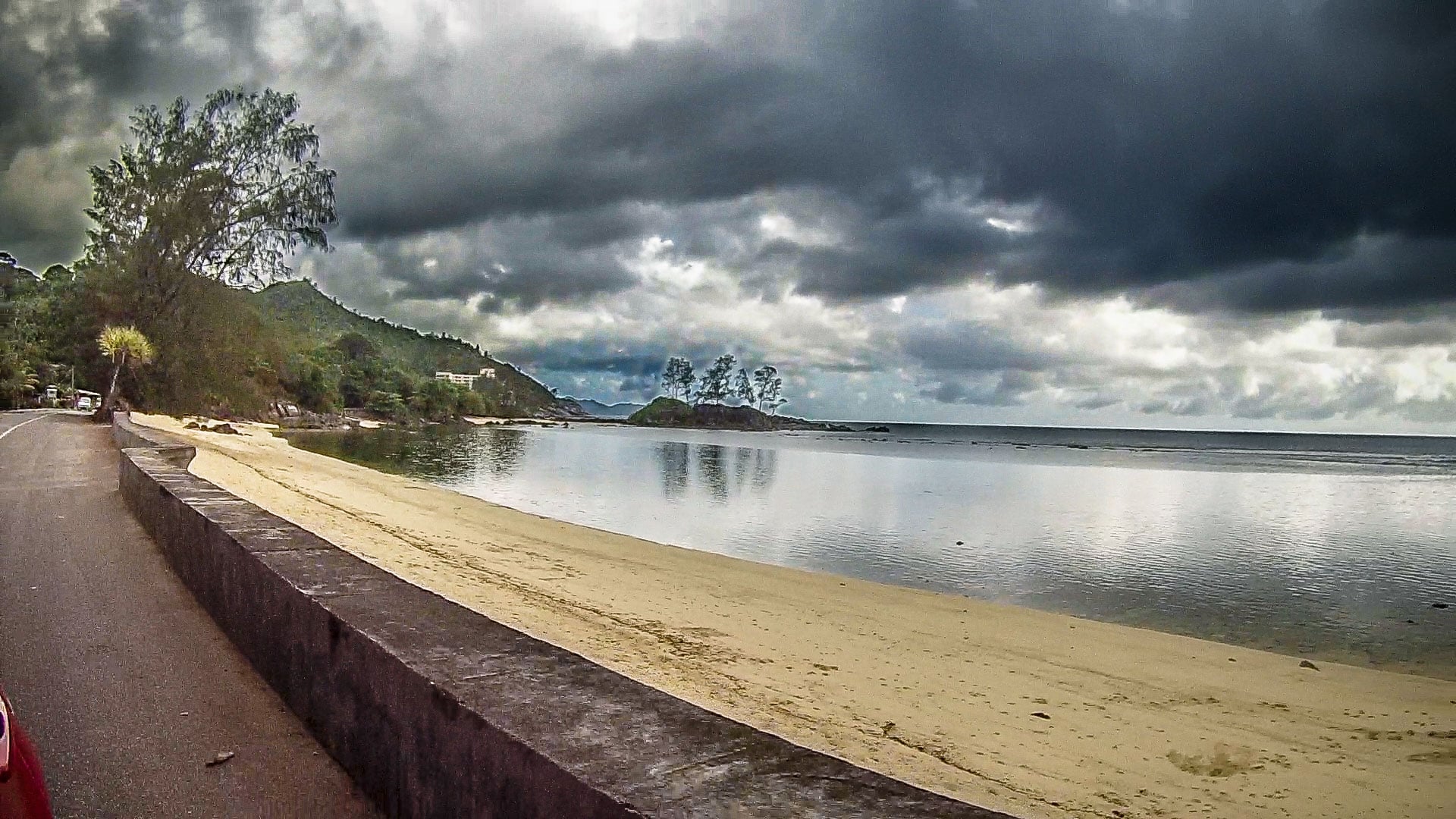 Beach at Port Glaud, north Mahe, Seychelles with abandoned hotel in background
