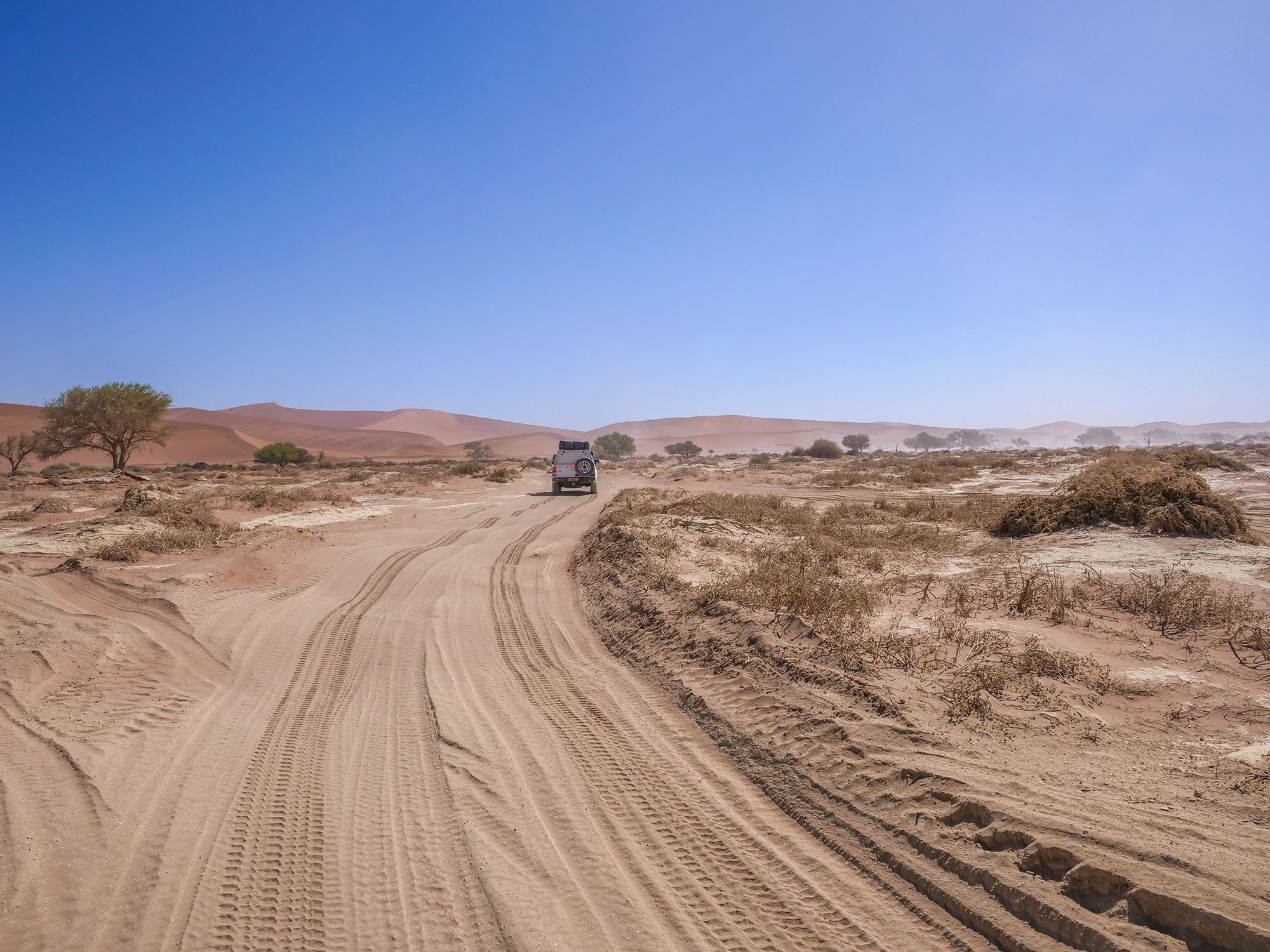 Toyota Hilux self-drive 4×4 in Sossusvlei with sand dunes, Namib Desert in Namibia, Africa