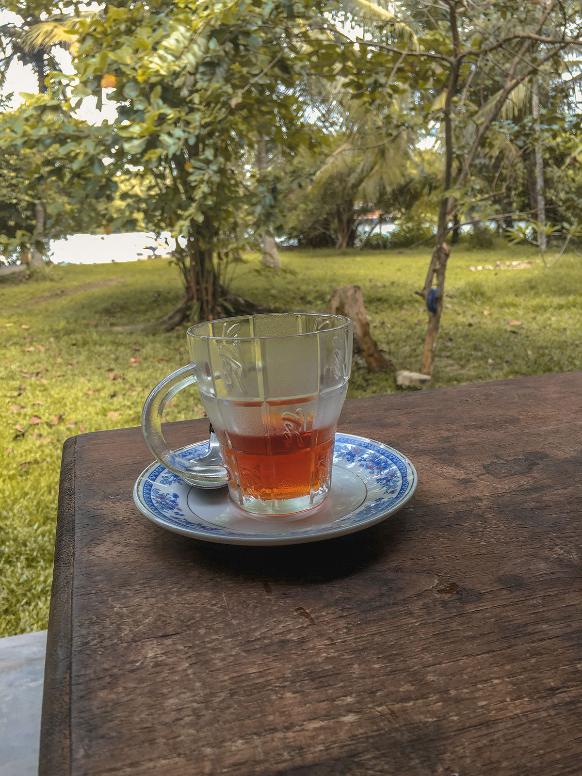 I was impressed with the beautiful decor of our room. It even had an air-conditioning unit which was a real luxury! Just outside our room and en suite was a little seating area with gorgeous views of the gardens and through the trees, the river! Here we were given a welcoming drink of Sri Lankan tea.