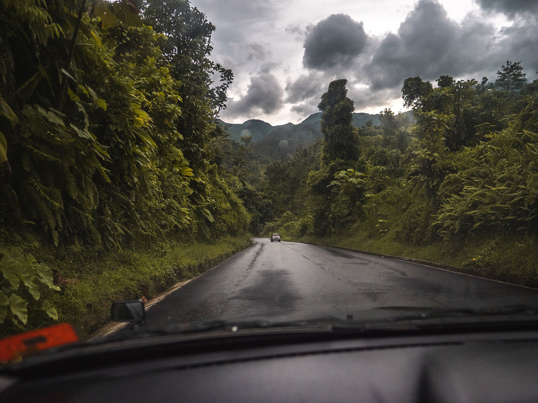 I gazed at the landscape which enveloped us. It was spectacular. The freshly-tarred road (fresh as it was all rebuilt after Hurricane Maria in 2017) was surrounded by thick foliage which was a spectrum of different shades of green.