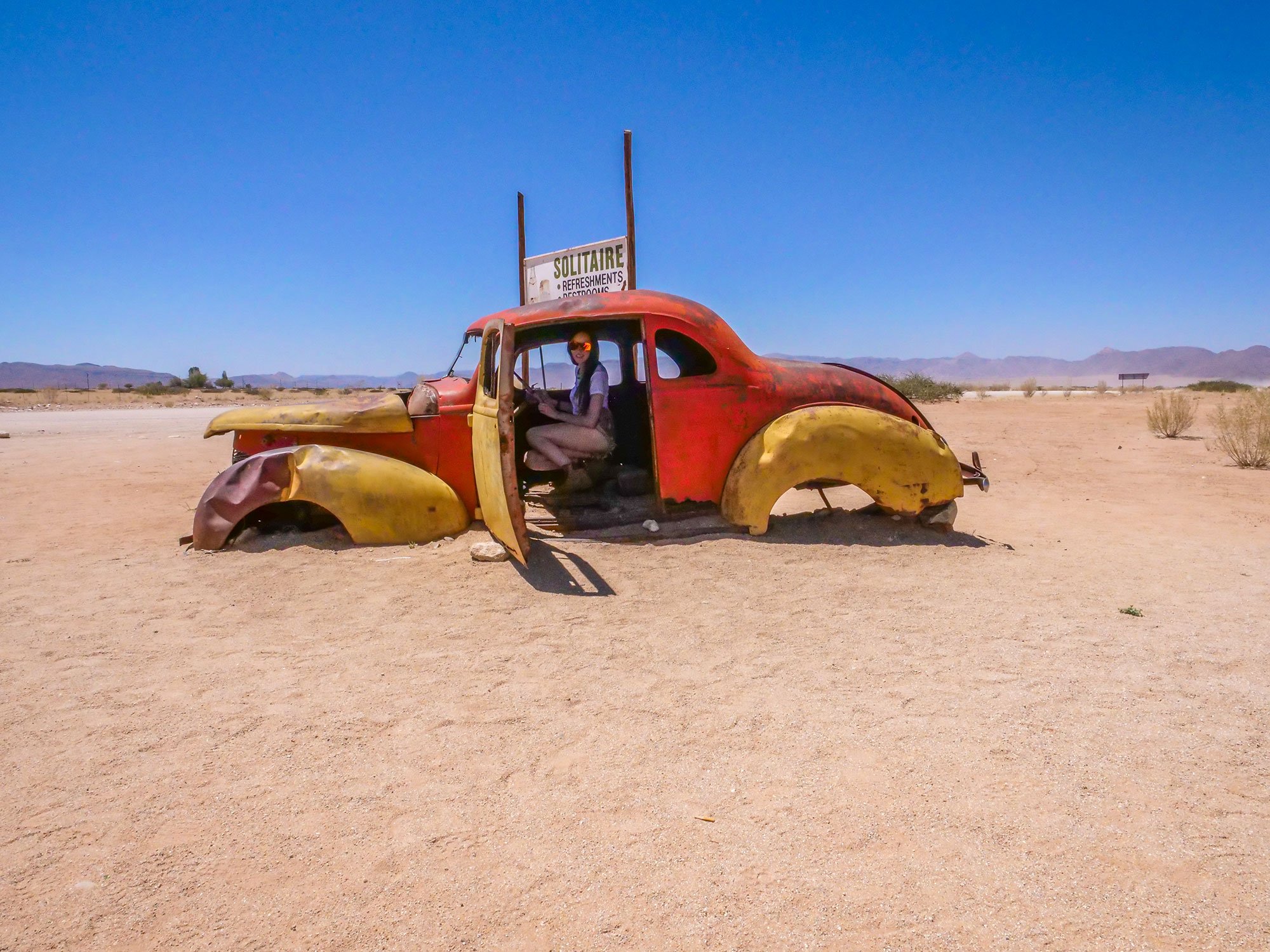 Ella in rusty car at Solitaire in Namib Desert, Namibia, Africa