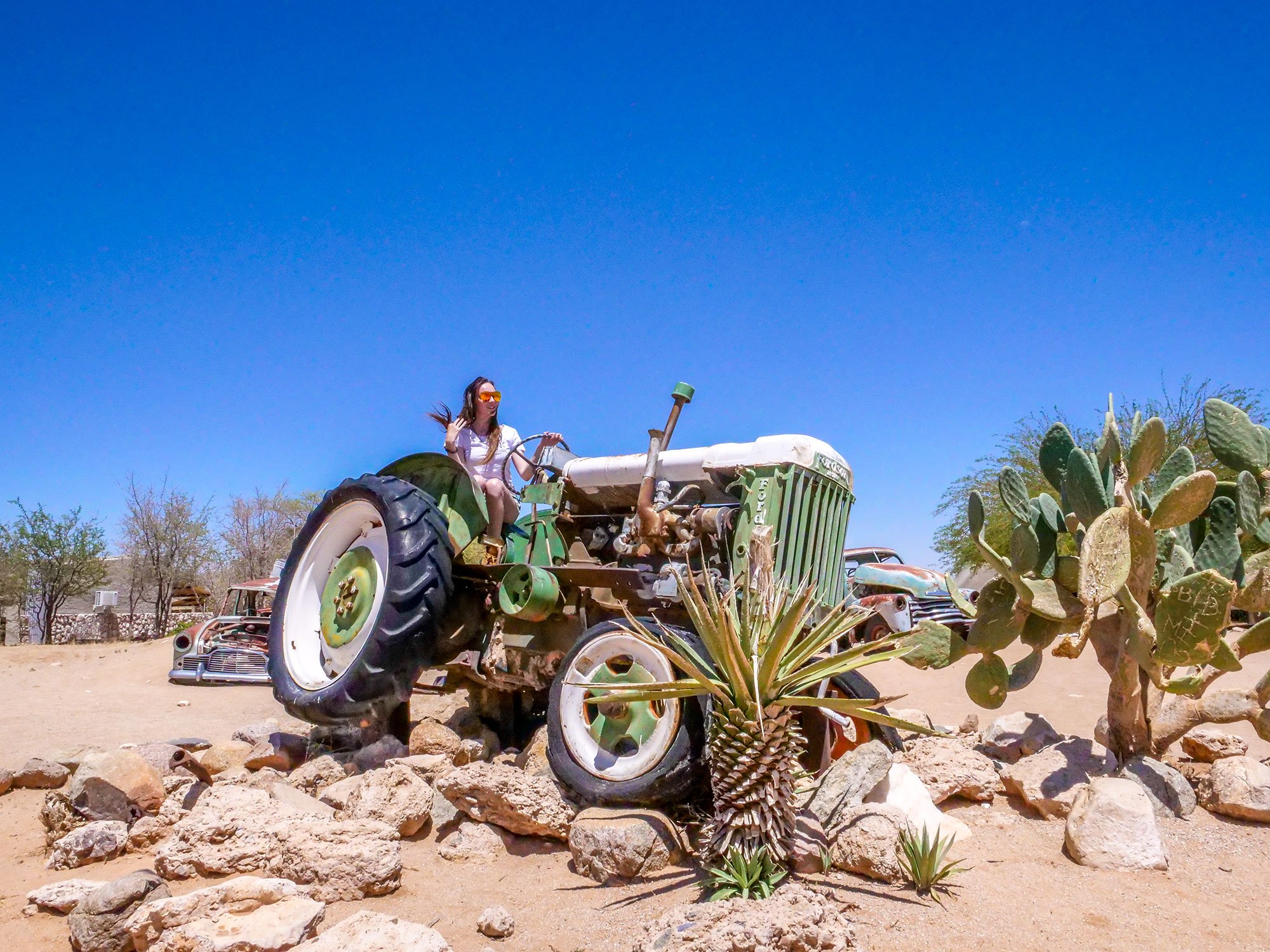 Ella on rusty tractor at Solitaire in Namib Desert, Namibia, Africa