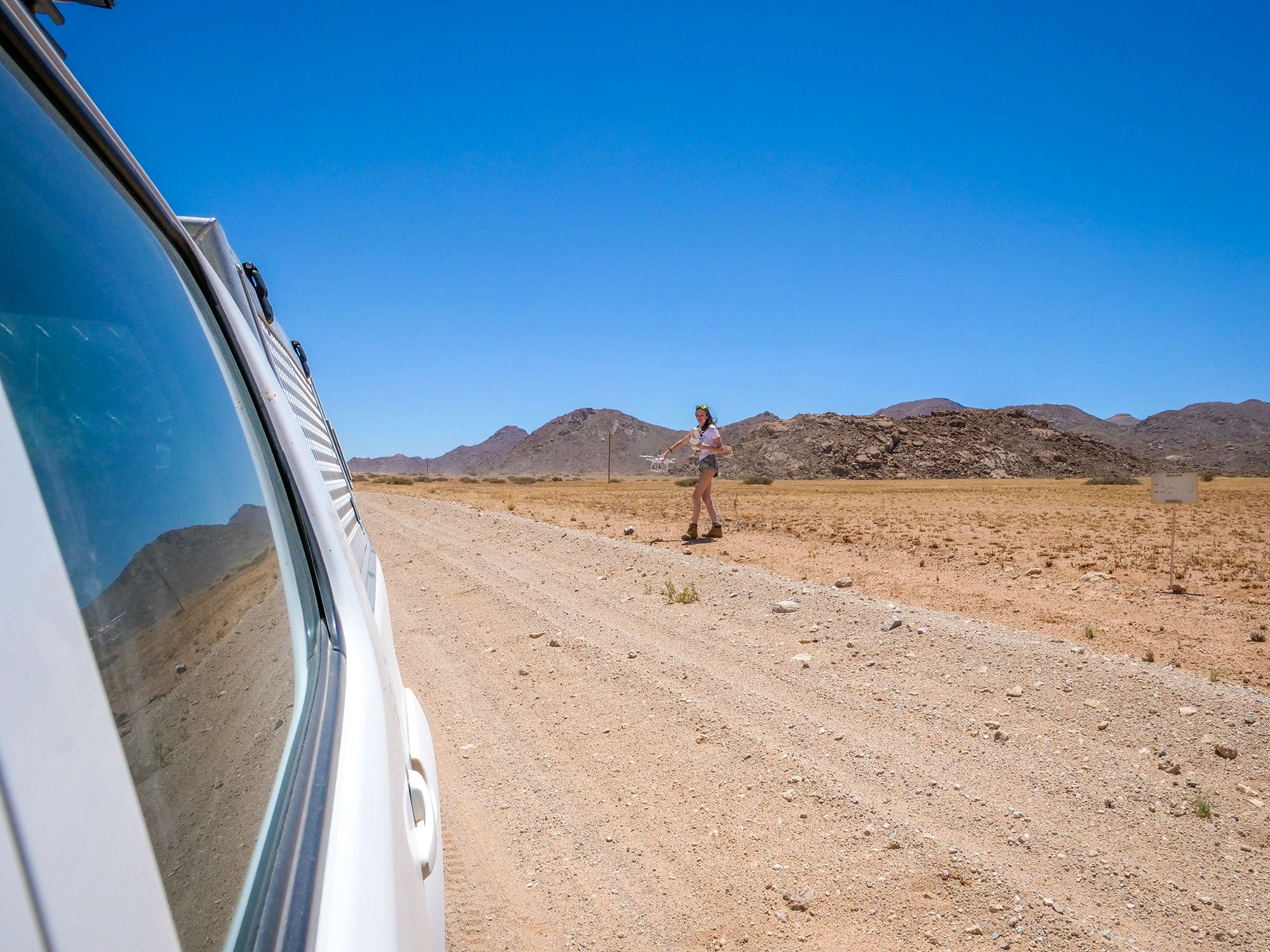 Ella with drone in Namib Desert in Namibia, Africa