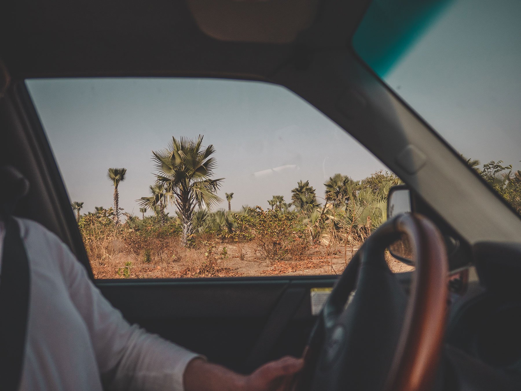 The initial stage of the journey consisted of a wide scarred road flanked by fields and windswept palms. I remembered this well enough.