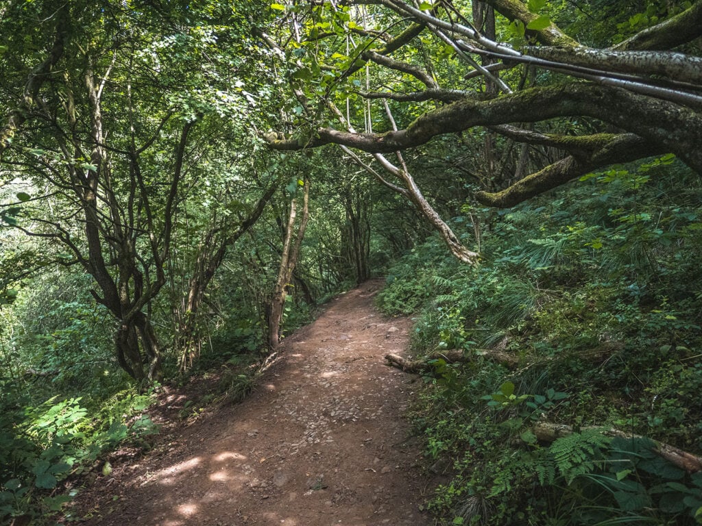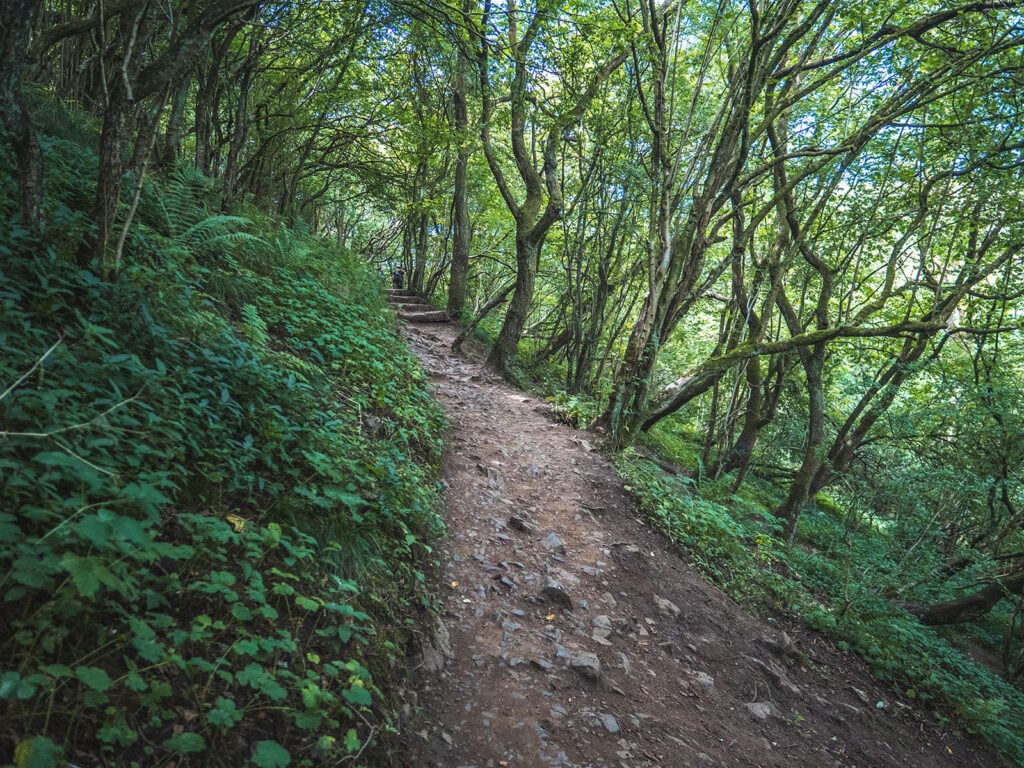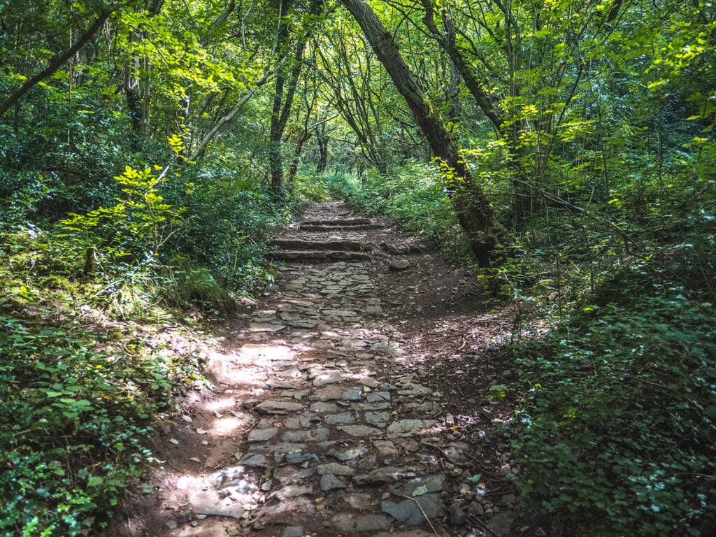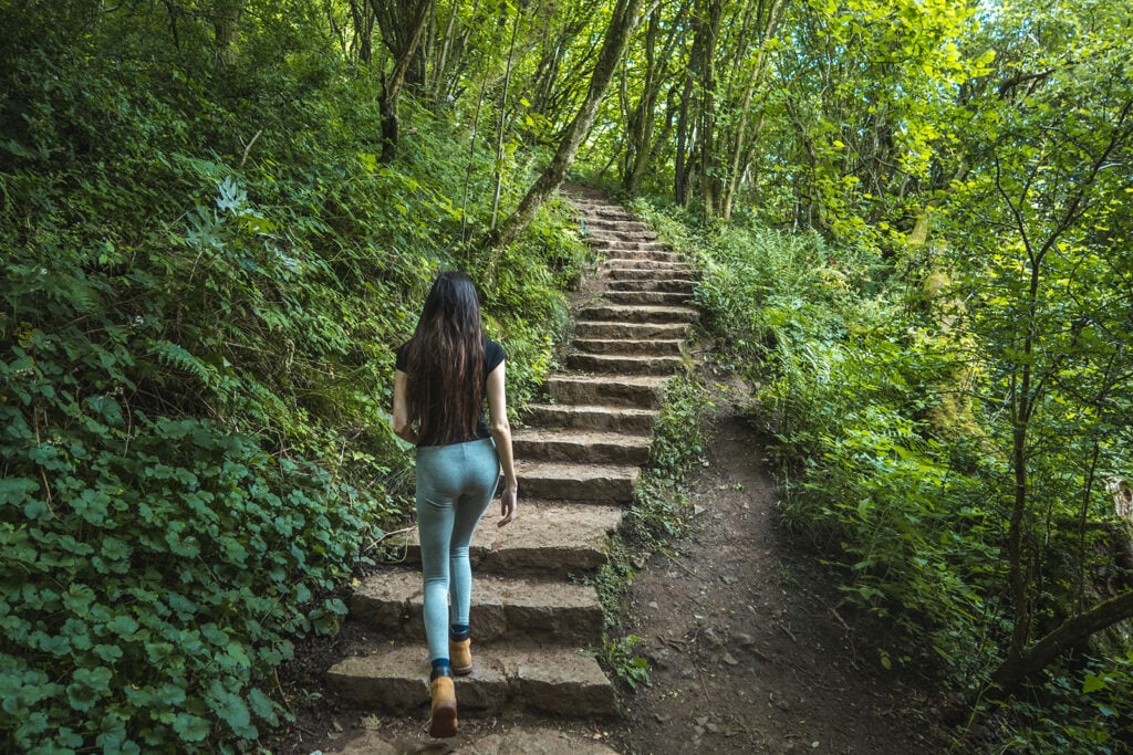 Terrain Description: A combination of a wide tarmac track, wide gravel tracks, stone steps, steep ascents on loose earth (such as to reach Reynard’s Cave), unpaved and uneven trails through undergrowth and over hills.