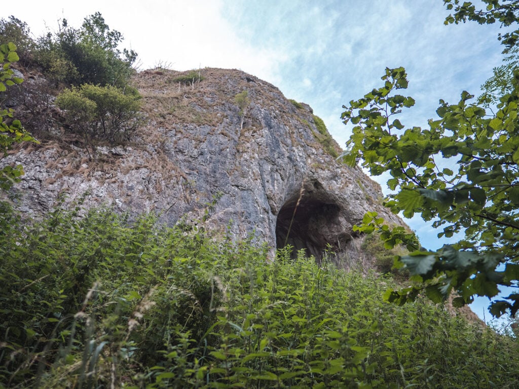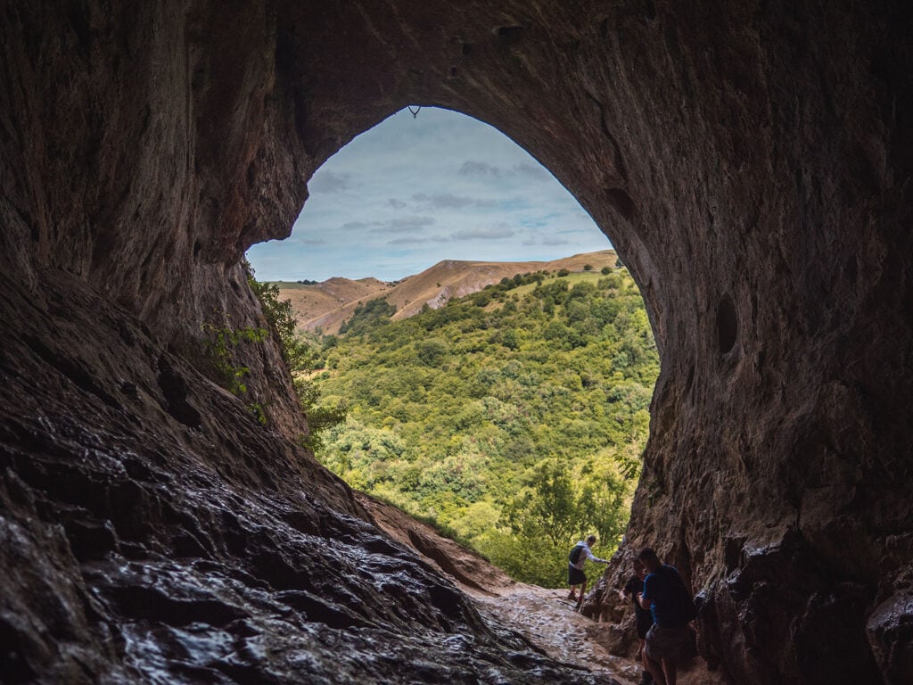 Thor’s Cave is a natural cavern carved within a steep limestone crag, 80 metres high. The entrance is via a symmetrical arch measuring 7.5 metres wide and 10 metres high.