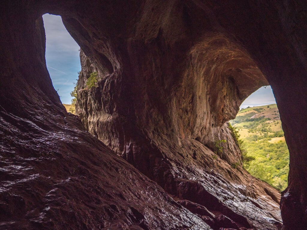 Thor’s Cave is a natural, cool cave with a great deal of light from the different openings in the limestone. The only sections not illuminated are the two deeper tunnels into the cave, which actually link up via a small opening in the tunnel walls.