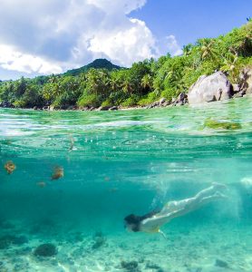Ella snorkelling at Anse Royale beach on Mahe island, Seychelles